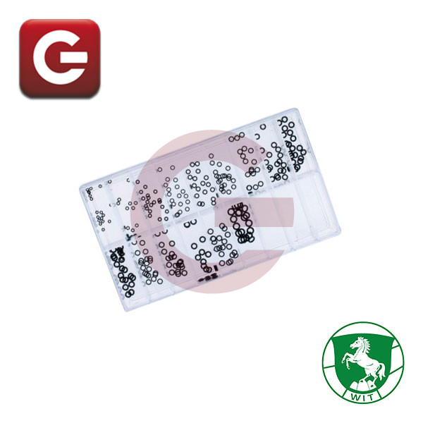 Surtido de 300 juntas, en estuche plástico con departamentos.20 juntas por diámetro ( Ø 0,8 x 0,4 al 2,15 x 0,75)Guia de diámetros en la tapa del estuche..