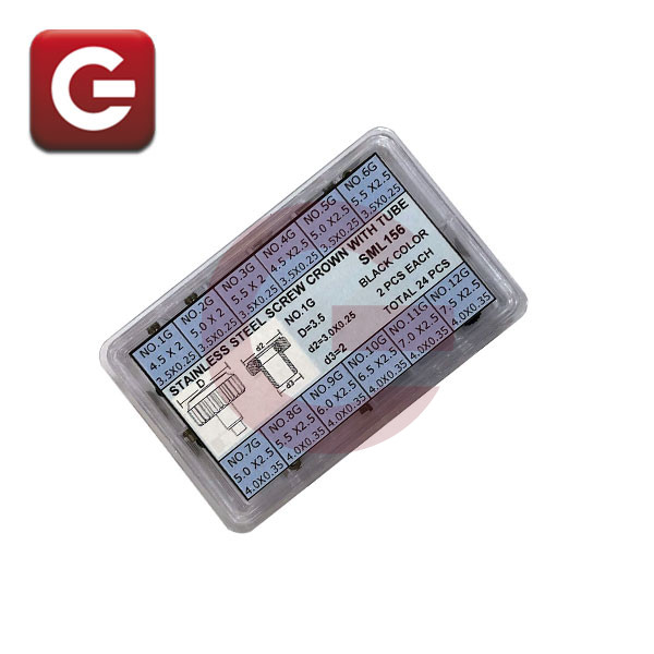 SURTIDO DE 24 CORONAS ROSCADAS ACERO.Contenido del surtido: 2 corona de cada referencia: CORONA + TUBO.12 referencias en Acero.En estuche de plástico con departamentos.Tabla de referencias en la tapa del estuche...
