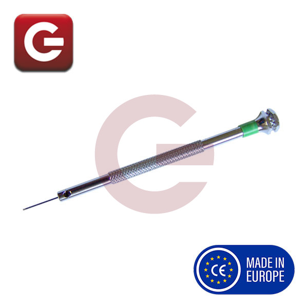 Destornillador CE de mechas recambiables.Cromado. Primera calidad. Aro de color verde claro.Punta plana. Diámetro: 0,50 mm...